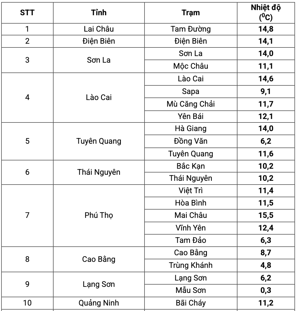 Khu vực vùng núi và núi cao rét sâu, Mẫu Sơn (Lạng Sơn) chỉ 0,3 độ C, Trùng Khánh (Cao Bằng) 4,8 độ C, Đồng Văn (Tuyên Quang) 6,2 độ C, Tam Đảo (Phú Thọ) 6,3 độ C, Sa Pa (Lào Cai) 9,1 độ C. Một số nơi khác ở miền núi phía Bắc như Mộc Châu 11,1 độ C, Mù Cang Chải 11,7 độ C, Yên Bái 12,1 độ C.