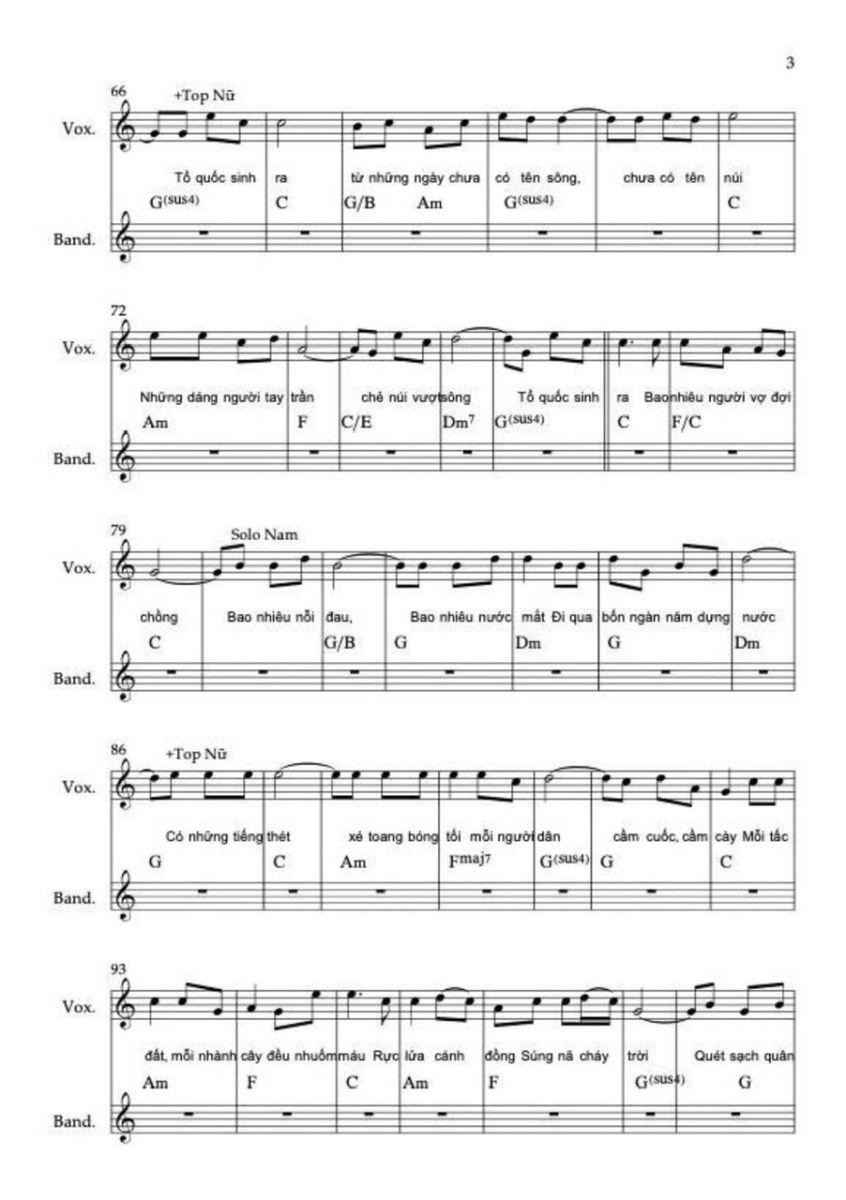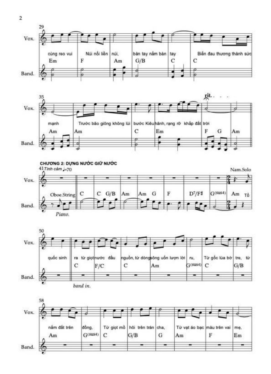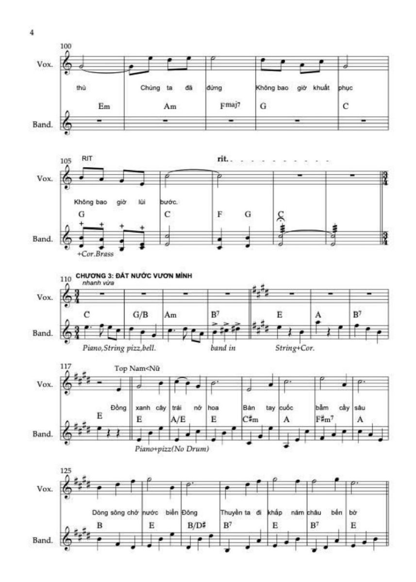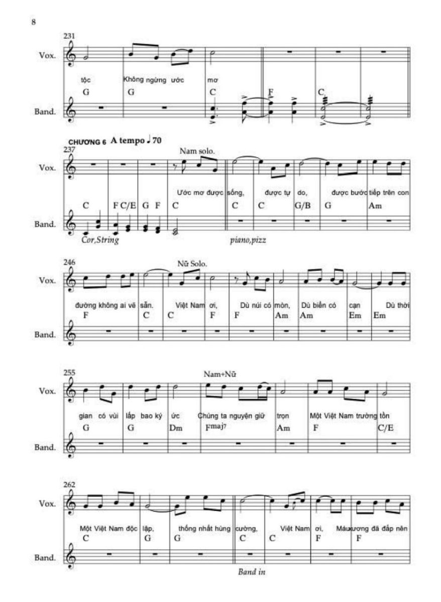 Chương này sử dụng hợp âm chủ đạo C, C6, F/C, G/C. Sử dụng thêm maj6 vì nó không căng như maj7, không mơ hồ như add9, rất phù hợp với “ước mơ được sống”. Điều cực kỳ quan trọng là ở “Việt Nam muôn năm” không add9, không sus, không màu treo mà chỉ còn hợp âm đầy, trường độ dài, tất cả các nốt trong cùng hợp âm rộng vang lên. Lời thề không được có dấu hỏi hòa âm.