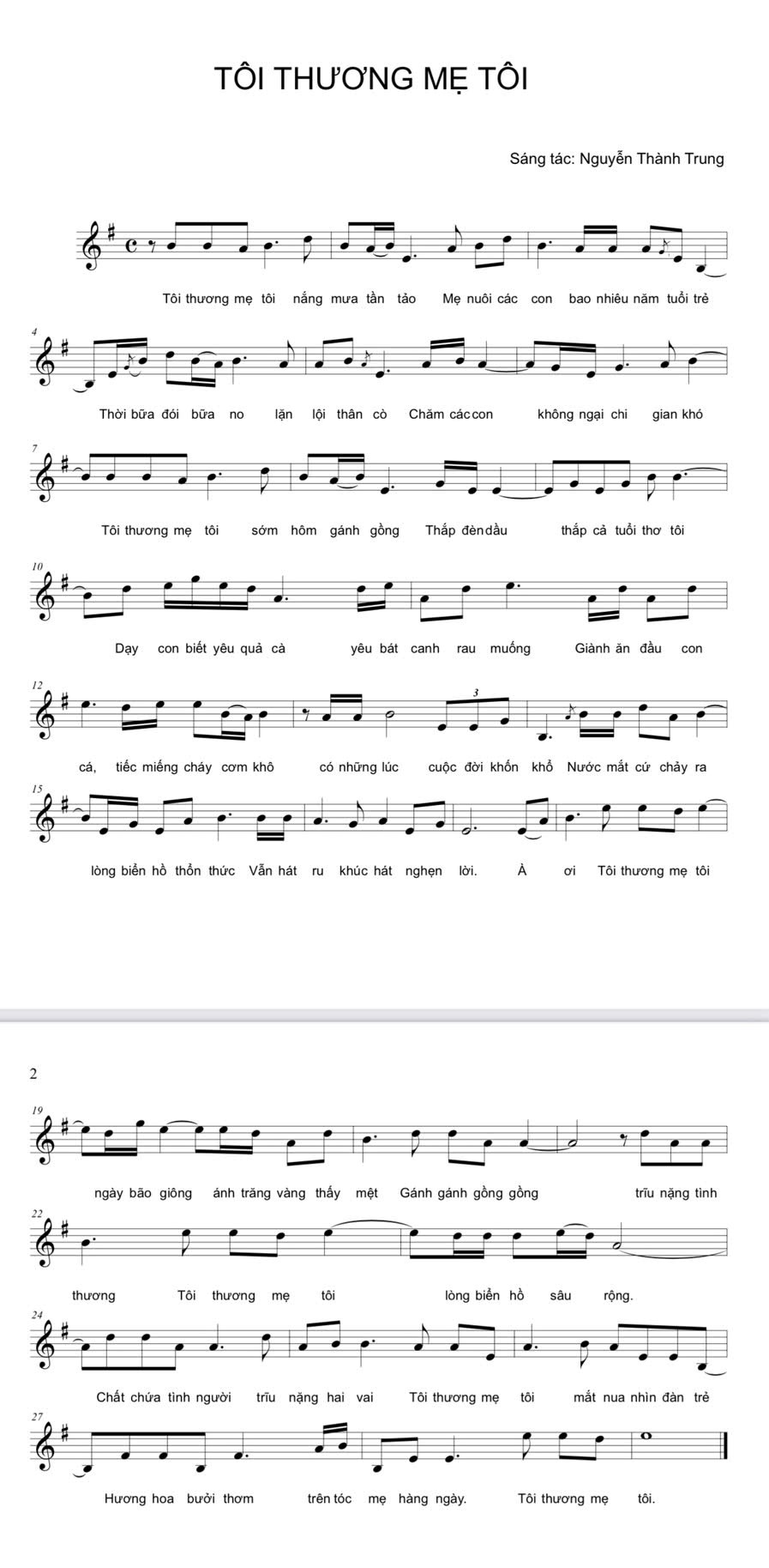 Câu kết, giai điệu rơi nhẹ về tông thấp, như một tiếng lòng chan chứa “Tôi thương mẹ tôi”. Cấu trúc khúc thức tự sự mở rộng, giai điệu liền bậc, ít nhảy xa quãng rộng để tạo sự liền lạc, nối tiếp tự nhiên giữa các nốt, tạo không gian mơ màng từ đó giúp bài hát không bị khô cứng, mà mềm mại, thủ thỉ, giống như một hành trình từ hồi ức tuổi thơ đến sự ngộ ra, biết ơn tình mẹ khi trưởng thành, rất phù hợp với dòng nhạc dân ca trữ tình.