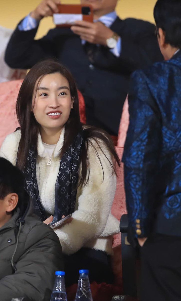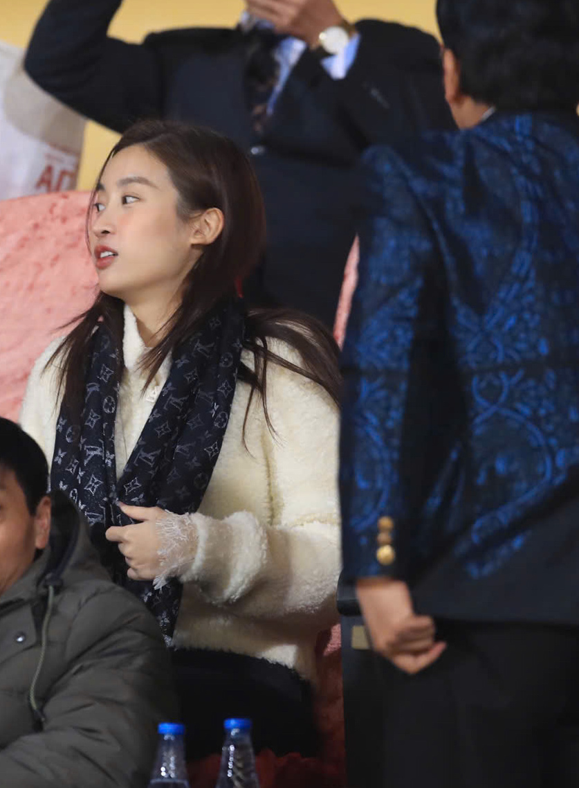 Mỹ Linh diện áo lông trắng, quàng khăn ngồi phía trên chồng là Đỗ Vinh Quang. Dù không trang điểm nhưng nhan sắc của cô nàng khi xuất hiện vẫn được dân tình hết lời khen ngợi. Nhiều khán giả có mặt tại sân không ngần ngại dành lời khen hoa hậu Đỗ Mỹ Linh mỗi lần đến sân là chiếm luôn "spotlight" trên khán đài.