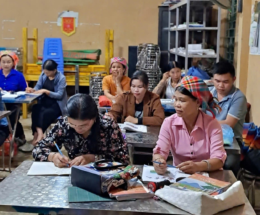 Sau bữa cơm tối vội vàng, bà con lại khoác áo, cầm đèn pin hoặc tranh thủ ánh sáng hiếm hoi của những con đường bản để đến lớp. Có người vừa đi vừa trò chuyện cho đỡ mệt, có người lặng lẽ bước nhanh vì sợ muộn giờ học. Đến lớp, họ ngồi ngay ngắn bên những bộ bàn ghế đã cũ, chăm chú nghe thầy cô hướng dẫn cách cầm bút, cách viết từng nét chữ đầu tiên. Với nhiều học viên, đây là lần đầu tiên trong đời họ được gọi là “học sinh”.