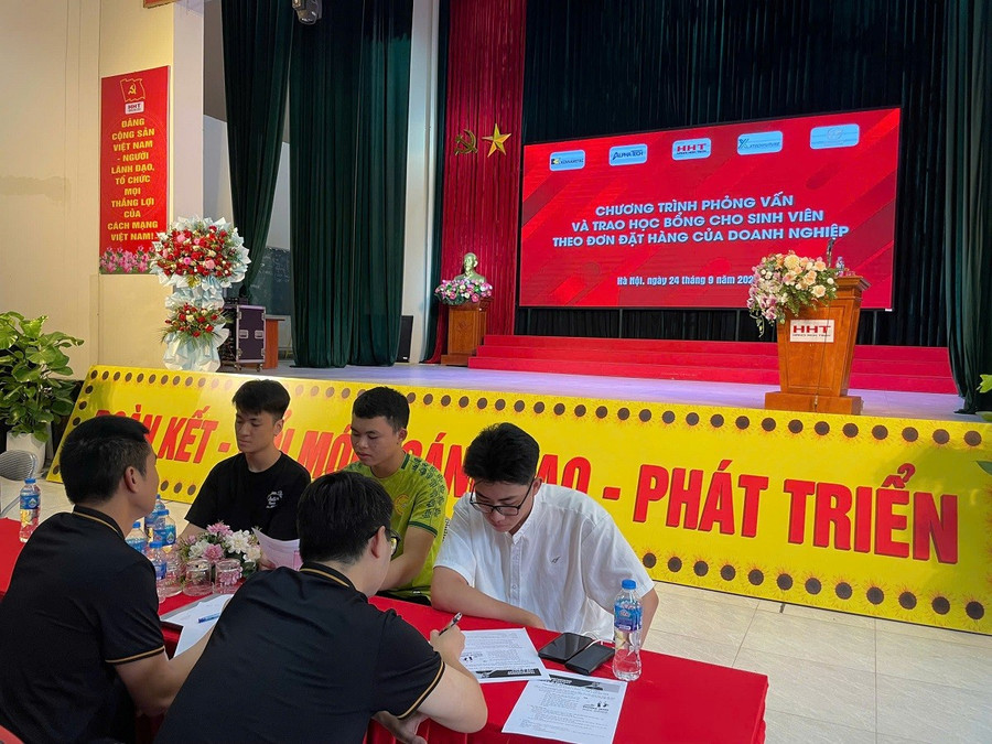 Nhà trường cùng các doanh nghiệp đối tác đã trực tiếp phỏng vấn, trao hàng trăm suất học bổng giá trị và cam kết tuyển dụng ngay từ khi sinh viên mới bước chân vào giảng đường.