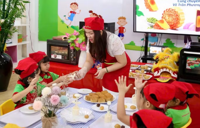 | Trẻ Trường Mầm non Ngôi nhà Hạnh Phúc trong hoạt động làm bánh Trung thu. Ảnh: MA |