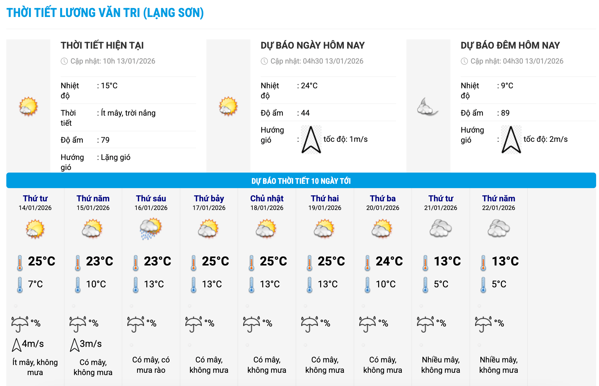 Biểu đồ nhiệt trong 10 ngày tới ở phường Lương Văn Tri (Lạng Sơn) và phường Lào Cai (Lào Cai) cập nhật vào 7 giờ ngày 13.1 cho thấy thời tiết tuần này duy trì trạng thái nắng hanh và bắt đầu chuyển biến rõ rệt từ ngày 21.1. Ảnh: Trung tâm Dự báo Khí tượng Thủy văn Quốc gia