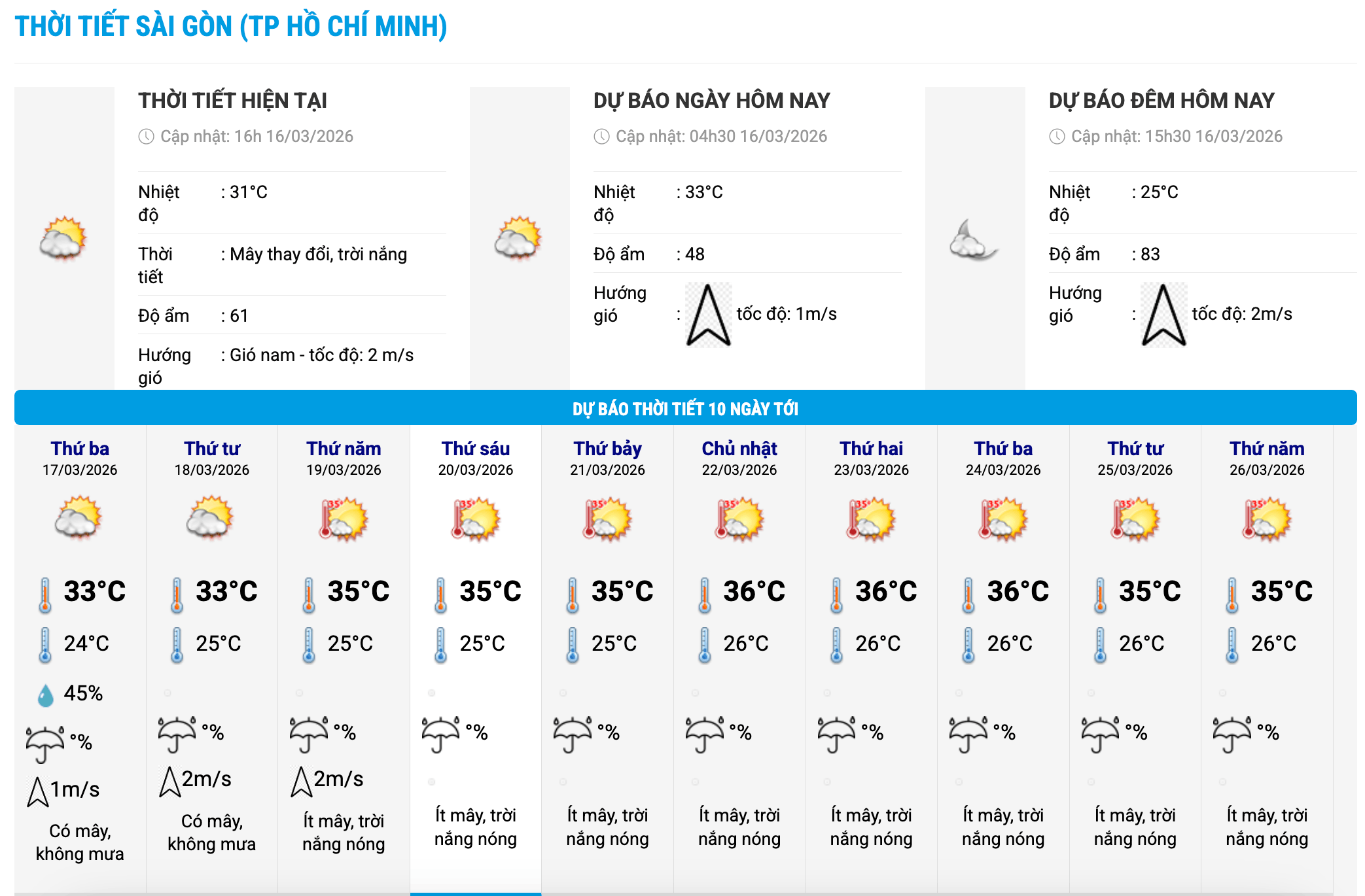 Biểu đồ nhiệt trong 10 ngày tới ở phường Sài Gòn, TPHCM cập nhật vào 16 giờ ngày 16.3. Ảnh: Trung tâm Dự báo Khí tượng Thủy văn Quốc gia
