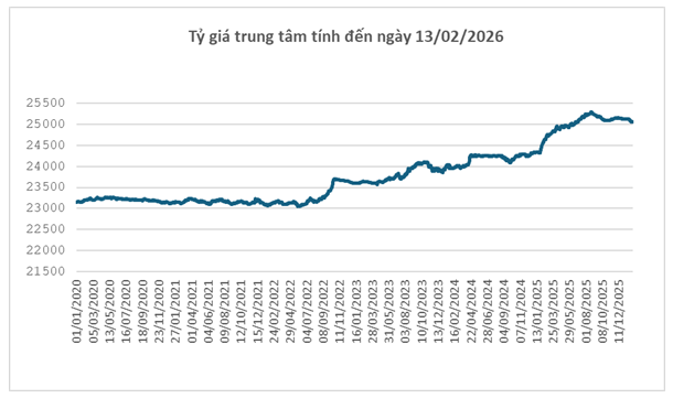 Trong nước, Ngân hàng Nhà nước Việt Nam công bố tỷ giá trung tâm ngày 13/02 ở mức 25,049 đồng/USD, giảm 16 đồng so với cuối tuần trước. Với biên độ ±5%, tỷ giá tại các ngân hàng thương mại được phép dao động trong khoảng 23,797 – 26,301 đồng/USD.
