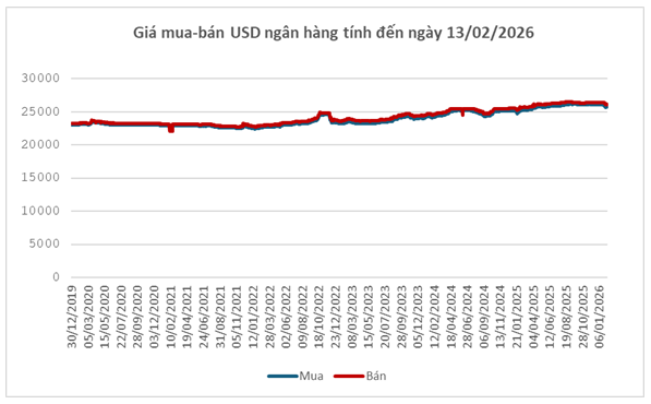 Chỉ số USD-Index (DXY) chốt phiên cuối tuần 13/02 ở mức 96.82 điểm, giảm 0.69 điểm so với tuần trước. Giá USD suy yếu sau khi Mỹ công bố chỉ số giá tiêu dùng (CPI) tháng 1/2026 tăng 2.4% so với cùng kỳ, thấp hơn mức dự báo 2.5% và tương đương tháng 4/2025 – thời điểm ông Donald Trump công bố chính sách thuế quan mạnh tay với phần lớn đối tác thương mại.