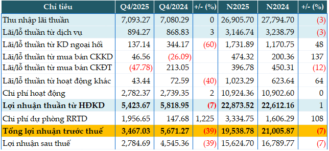 Năm 2025, thu nhập lãi thuần của ACB giảm nhẹ 3% so với năm trước, đạt 26,906 tỷ đồng. Lãi từ dịch vụ giảm 3% còn 3,147 tỷ đồng.