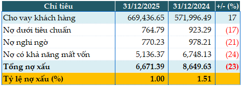 Chất lượng nợ vay là một trong những điểm sáng trong bức tranh kinh doanh năm 2025 của ACB. Nếu không tính 17,340 tỷ đồng cho vay giao dịch ký quỹ của Công ty TNHH Chứng khoán ACB (ACBS), đến ngày 31/12/2025, tổng nợ xấu của ACB chỉ còn 6,671 tỷ đồng, giảm 23% so với đầu năm. Tỷ lệ nợ xấu/dư nợ giảm từ mức 1.51% đầu năm xuống còn 1%. Tỷ lệ nợ xấu chỉ còn 0.97%, thấp nhất kể từ năm 2023.