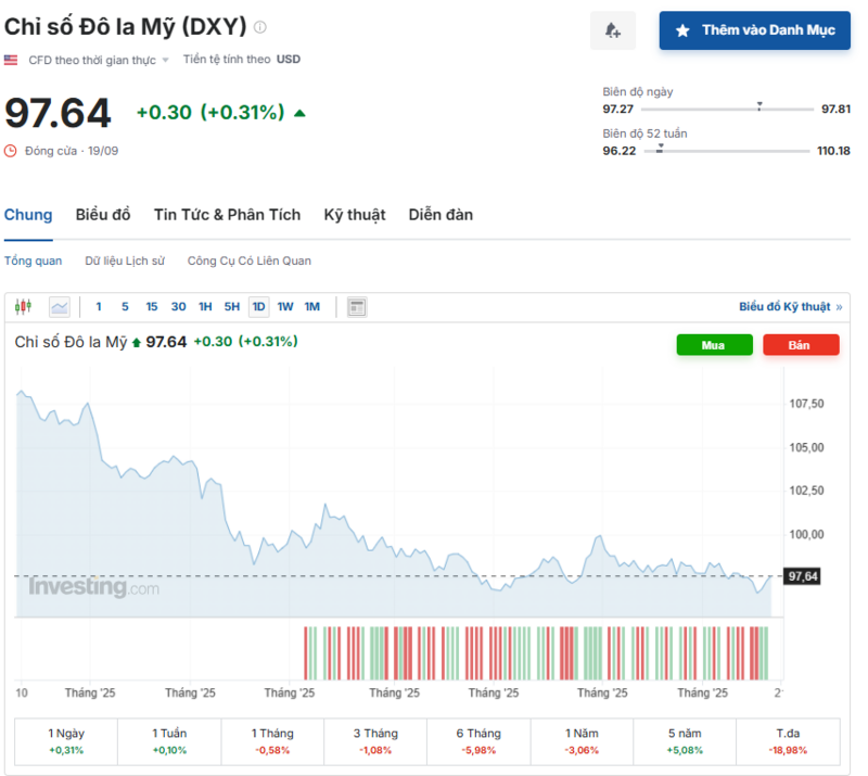Chỉ số Dollar Index (DXY), đo lường đồng USD với 6 đồng tiền chủ chốt (EUR, JPY, GBP, CAD, SEK, CHF), đã dừng ở mức 97.64 điểm, tăng 0.31% so với chốt ngày hôm qua.