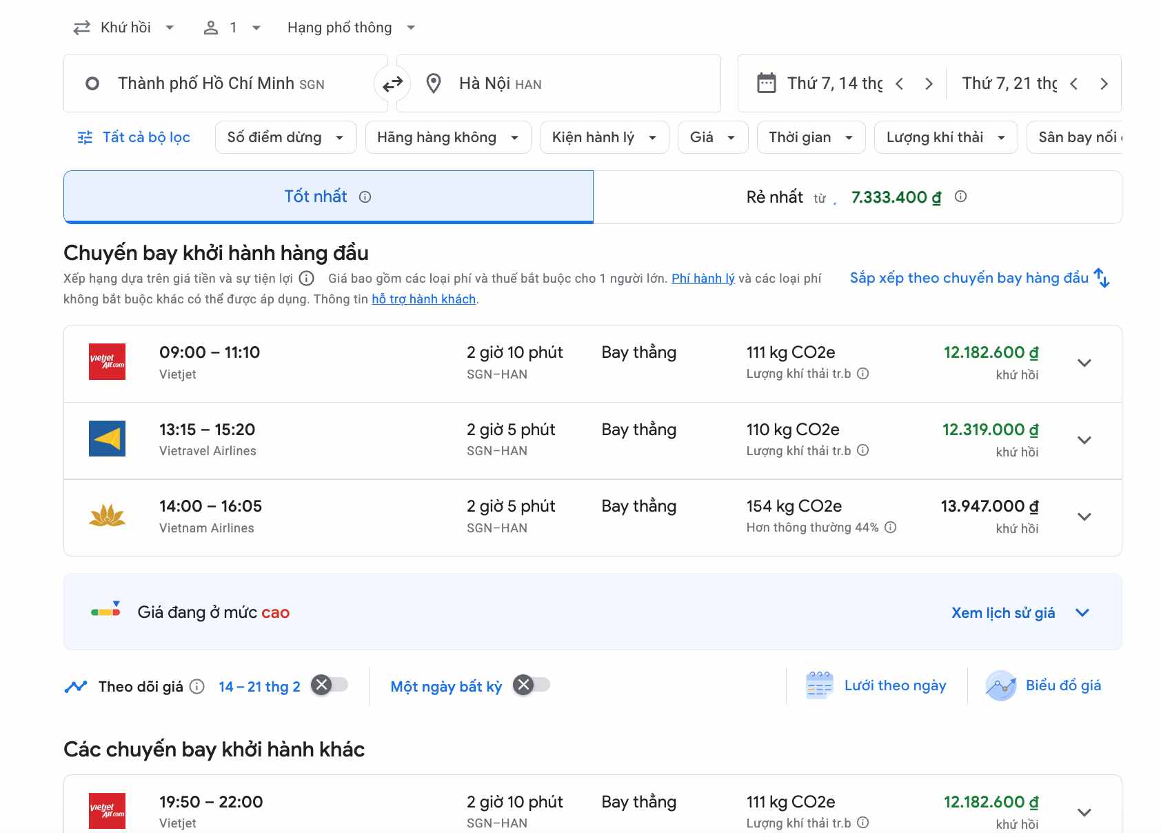 Trong khi, Vietnam Airlines chỉ còn ghế hạng phổ thông đặc biệt và hạng thương gia. Mức giá hạng phổ thông đặc biệt từ 5,3 triệu đồng/chiều, còn hạng thương gia lên tới gần 10 triệu đồng/chiều.