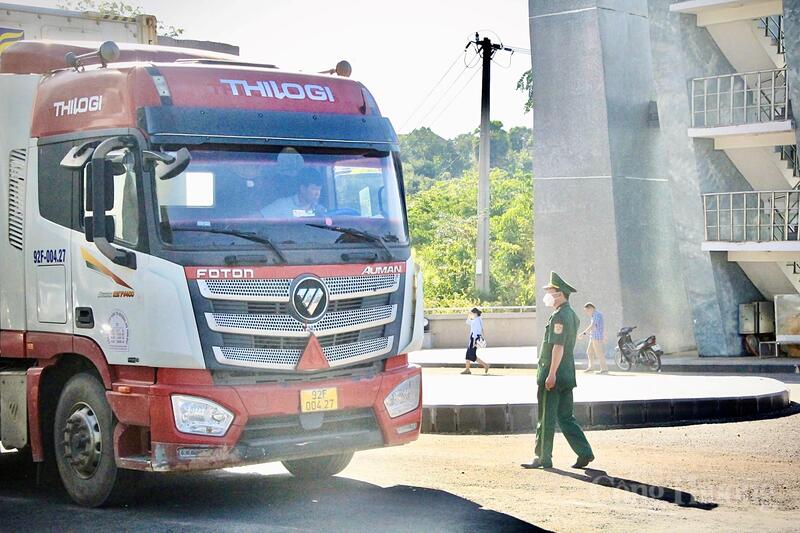 Lực lượng chức năng kiểm soát phương tiện qua lại Cửa khẩu Quốc tế Lệ Thanh. Ảnh: Hiền Mai