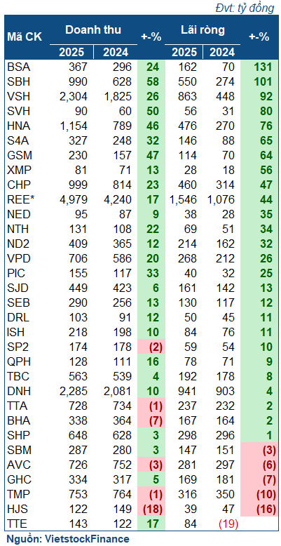 Về bức tranh chung, nhóm thủy điện trải qua năm 2025 khá thành công với chỉ 4 doanh nghiệp giảm lãi. Các thủy điện lớn như VSH, SBH, BSA, HNA đều nằm trong top đầu tăng trưởng, lợi nhuận tăng từ 76-130%. Mảng điện của REE cũng tăng tới 44%, đạt hơn 1.5 ngàn tỷ đồng.