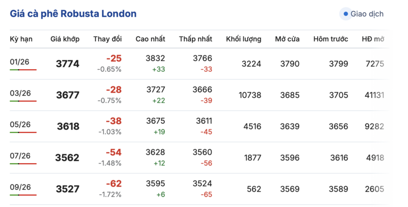 Kết thúc phiên giao dịch gần nhất, giá cà phê Robusta tại London giảm nhẹ đồng loạt qua các kỳ giao hàng. Cụ thể, kỳ giao tháng 1/2026 giảm 25 USD/tấn, xuống mức 3774 USD/tấn. Trong khi hợp đồng giao kỳ hạn tháng 9/2026 giảm 62 USD/tấn, xuống mức 3527 USD/tấn.