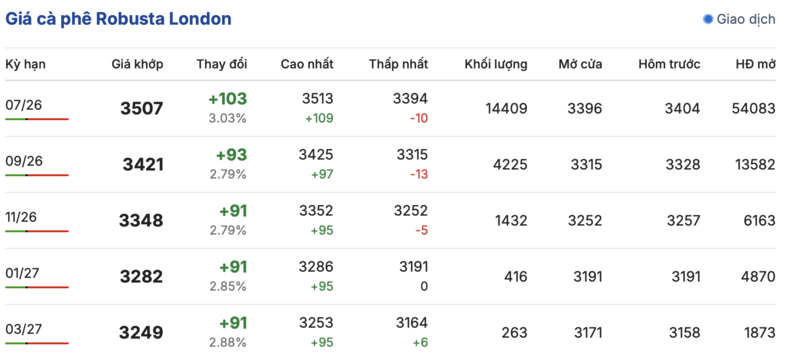 Cụ thể, trên sàn giao dịch London, giá cà phê Robusta hợp đồng giao kỳ hạn tháng 7/2026 tiếp tục tăng mạnh 103 USD/tấn so với hôm qua, lên mức 3.507 USD/tấn. Hợp đồng giao kỳ hạn tháng 3/2027 cũng tiếp tục tăng 91 USD/tấn, đạt 3.249 USD/tấn.