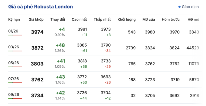 Kết thúc phiên giao dịch gần nhất, giá cà phê Robusta tại London tiếp tục tăng nhẹ đồng loạt trong các kỳ giao hàng. Cụ thể, kỳ giao tháng 1/2026 tăng 4 USD/tấn, lên mức 3974 USD/tấn. Hợp đồng giao kỳ hạn tháng 9/2026 tăng 42 USD/tấn, lên mức 3734 USD/tấn.
