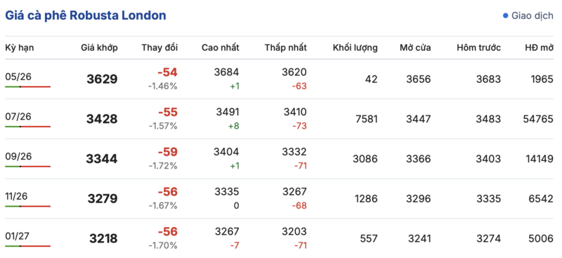 Cụ thể, trên sàn giao dịch London, giá cà phê Robusta hợp đồng giao kỳ hạn tháng 5/2026 tiếp tục giảm nhẹ 54 USD/tấn so với hôm qua, xuống mức 3.629 USD/tấn. Hợp đồng giao kỳ hạn tháng 1/2027 cũng tiếp tục giảm nhẹ 56 USD/tấn, đạt mốc 3.218 USD/tấn.