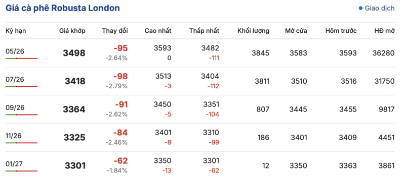 Cụ thể, trên sàn giao dịch London, giá cà phê Robusta sáng nay ghi nhận phiên sụt giảm đồng loạt trong các kỳ giao hàng. Trong đó, kỳ giao tháng 3/2026 tiếp tục giảm mạnh 95 USD/tấn, đạt mức 3.498 USD/tấn. Cùng chiều, hợp đồng giao kỳ hạn tháng 1/2027 cũng giảm 62 USD/tấn, xuống mức 3.301 USD/tấn.
