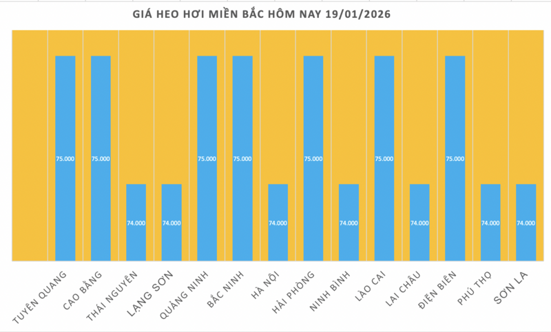 Thị trường heo hơi miền Bắc hôm nay (19/1) không ghi nhận biến động mới, tất cả các địa phương đều giữ nguyên mức giá từ phiên trước. Hiện giá heo tại miền Bắc dao động trong khoảng 74.000 - 75.000 đồng/kg.