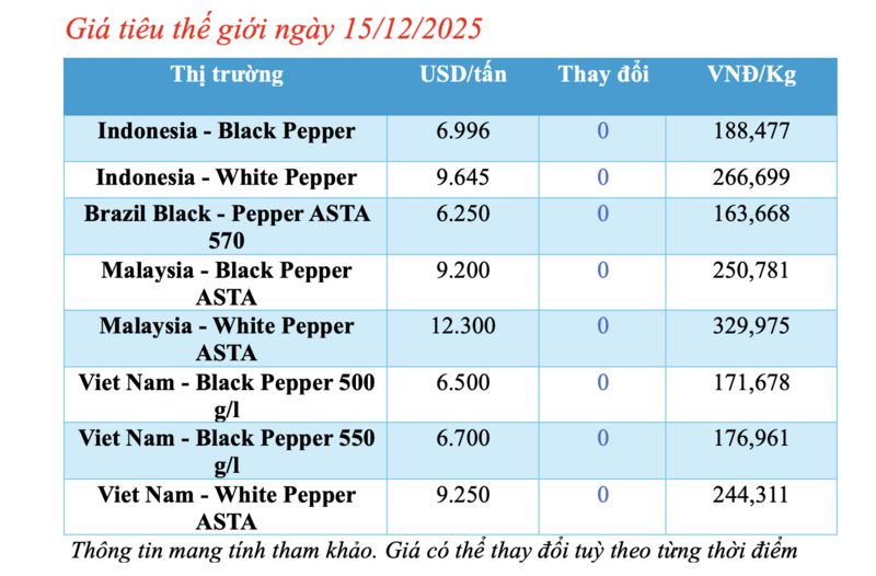 Cập nhật giá tiêu thế giới từ Hiệp hội Hồ tiêu Quốc tế (IPC) sáng 15/12/2025, hồ tiêu xuất khẩu hôm nay không ghi nhận biến động. Các thị trường đều ổn định giá so với phiên giao dịch hôm qua.
