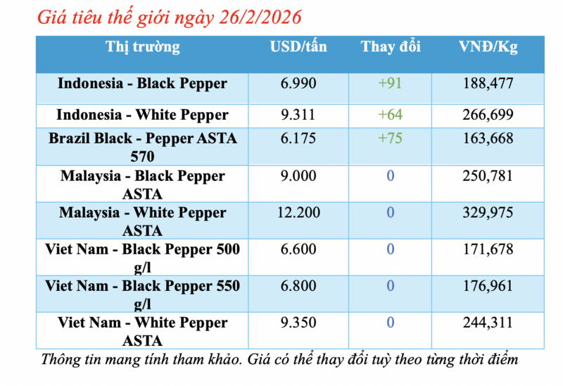 Cập nhật giá tiêu thế giới từ Hiệp hội Hồ tiêu Quốc tế (IPC) sáng 26/2/2026, hồ tiêu xuất khẩu hôm nay ghi nhận biến động mới từ thị trường Indonesia và Brazil. Các thị trường khác đều duy trì mức giá ổn định so với phiên giao dịch trước.